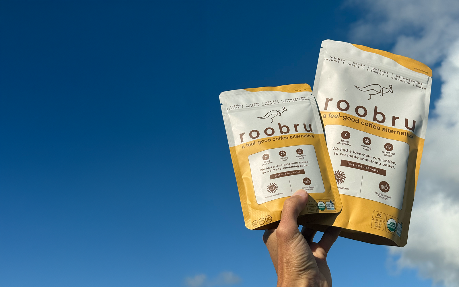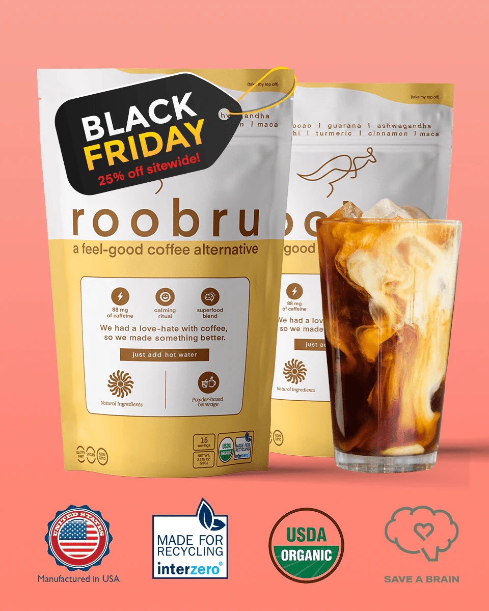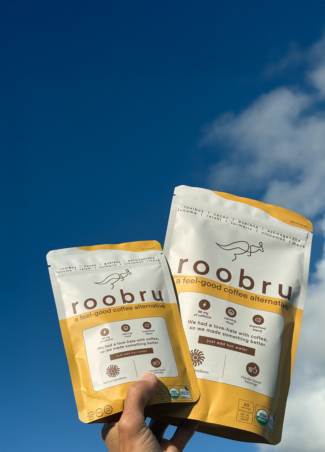 roo.bru tastes like chai, hot chocolate, and coffee had a baby. It’s vegan, USDA organic, and gluten-free, with no additives, sweeteners, or nonsense—just pure, powerful ingredients: rooibos, cacao, lucuma, guarana, reishi, maca root, ashwagandha, turmeric & cinnamon. Give yourself the morning (or afternoon) you deserve.